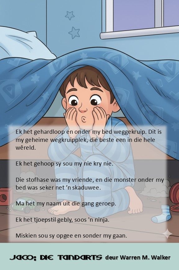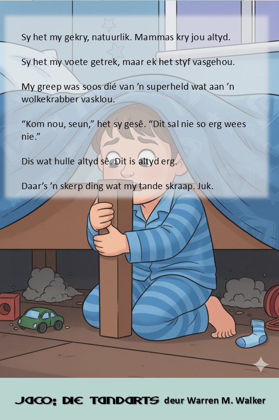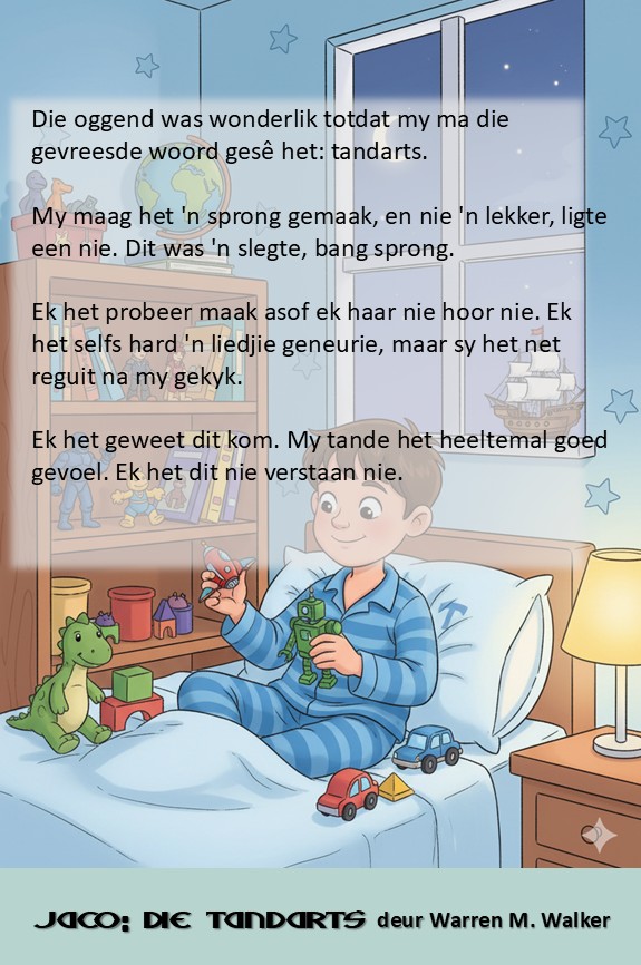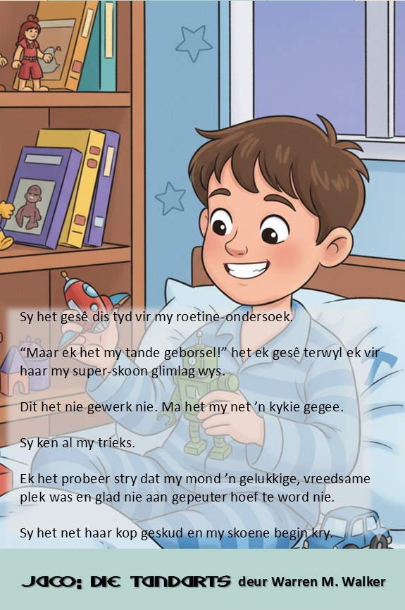 Die Tandarts (Jack The Dentist) is ‘n pragtig geïllustreerde storieboek wat die angs wat baie kinders oor tandartsbesoeke voel, perfek vasvang—en wys hoe ‘n bietjie dapperheid tot ‘n baie gelukkige einde kan lei.